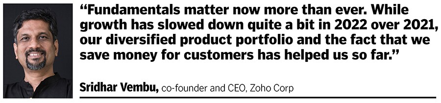 “Growth has slowed down quite a bit in 2022 over 2021," Vembu says, but companies such as Zoho, offering diversified product portfolios and saving money for customers, are winning.