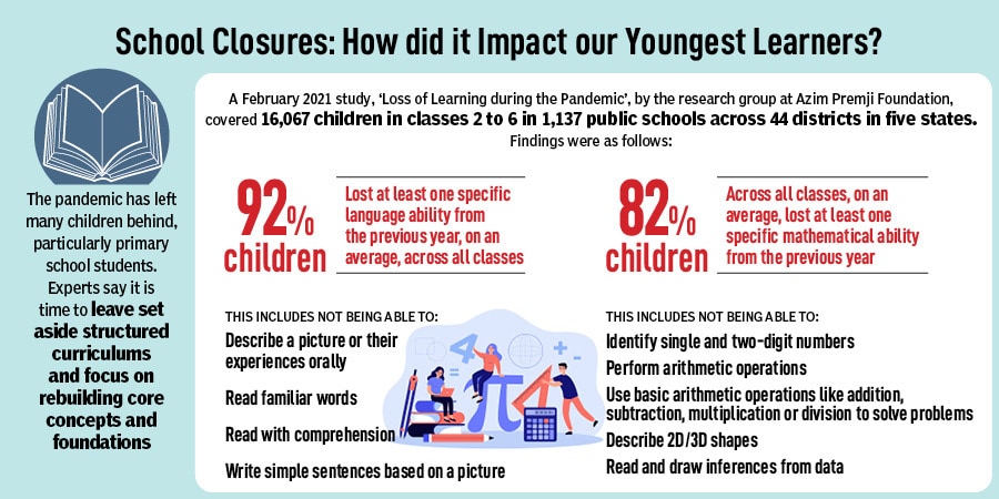 The academician points to how the National Education Policy (NEP), with a firm focus on foundational education, says that the first eight years of a child’s life are crucial. “Children are already two years behind from their grade-appropriate levels of learning. While high school students have some foundational base and can also study on their own if provided with materials, that is not the case with younger, primary school children. So those children should be our first focus."