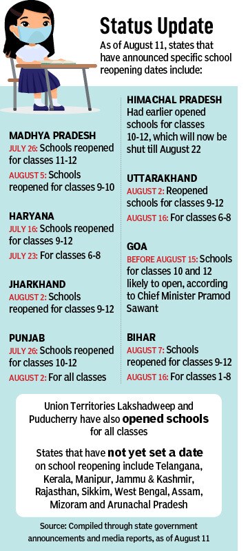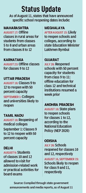 On July 27, the Central government said that states will have to take the final decision about reopening schools, in the wake of which a handful of states have made announcements [see box ‘Status Update’] and released Standard Operating Procedures (SOPs) for reopening of schools.