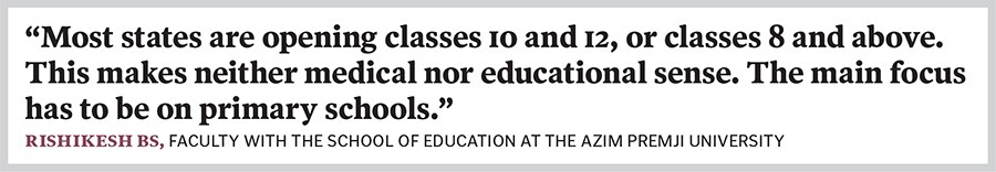 “Nobody is thinking hard about it," says Rishikesh, referring to states. For instance, he explains, opening of primary schools needs to be given more priority over secondary schools and colleges. “But there continues to be this obsession with Board exams," he says.