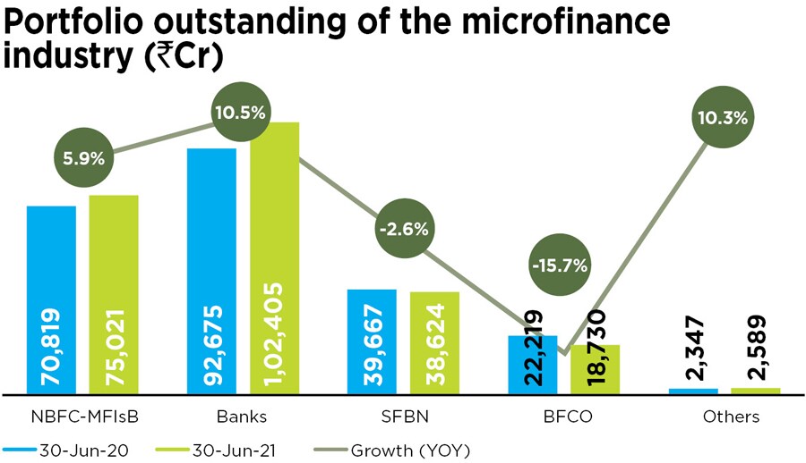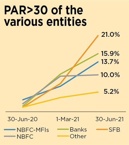 Pre-pandemic NPAs averaged at 1-2 percent, which is about the same as for retail lenders. That number has now moved to as high as 6-7 percent. The delinquency numbers, too, as they stand, are high. Portfolio at risk >30—the percentage of the microfinance portfolio of eight small finance banks (SFBs) overdue by more than 30 days—is estimated to have surged to 21 percent as of June end, compared to 7.61 percent in March this year, according to data from ratings agency ICRA.
