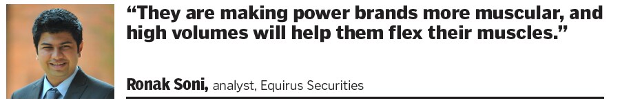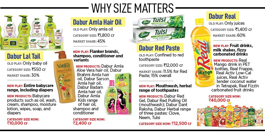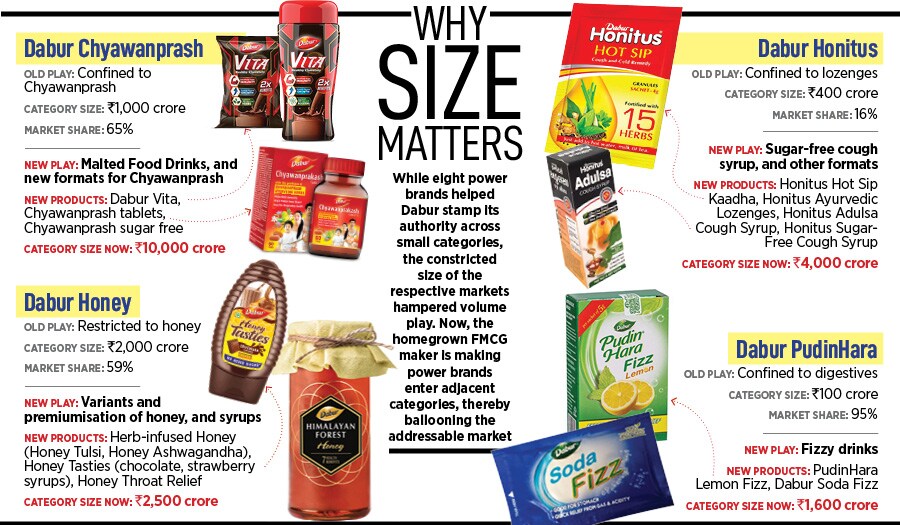 Take, for instance, Honitus, another power brand which always existed in the form of cough syrup and lozenges. A few months back, Dabur rolled out sugar-free cough syrup and hot sip kadha, a traditional home remedy for the common cold and flu. The category play for Honitus ballooned from Rs 400 crore to Rs 4,000 crore. Then there is Dabur Lal Tail, massage oil for babies which is just a Rs 550-crore market and that Dabur rules with a 30 percent share. By rolling out an entire babycare range such as wash, cream, shampoo, moisturising lotion, wipes, soap, and diapers this year, the market opportunity for Dabur zooms to Rs 10,000 crore.