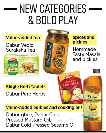 Take, for instance, the move to enter into value-added edibles and cooking oil with tea, ghee, cold-pressed mustard and sesame oil, and spices and pickles. “If a new product fails, then it doesn"t matter. We"ll try harder next time," he says. Within every power brand, he adds, Dabur intends to increase the addressable market. “That’s where the theme of ghar ghar Dabur comes into play. Every house should have a Dabur product," he says.
