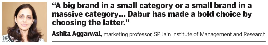 Dabur, reckon FMCG analysts, is finally waking up to the new realities and is tapping into its hidden potential. The transformation is not easy for a company that has always been fixated with margins and profits. For ages, what Dabur did was to either identify a niche or create a small segment and rule it. By virtue of being the market leader, it would make a profit. Now it wants to make profit by ramping up scale. “They have a right to win in most of the adjacent categories they are entering," says Ronak Soni, analyst at Equirus Securities.