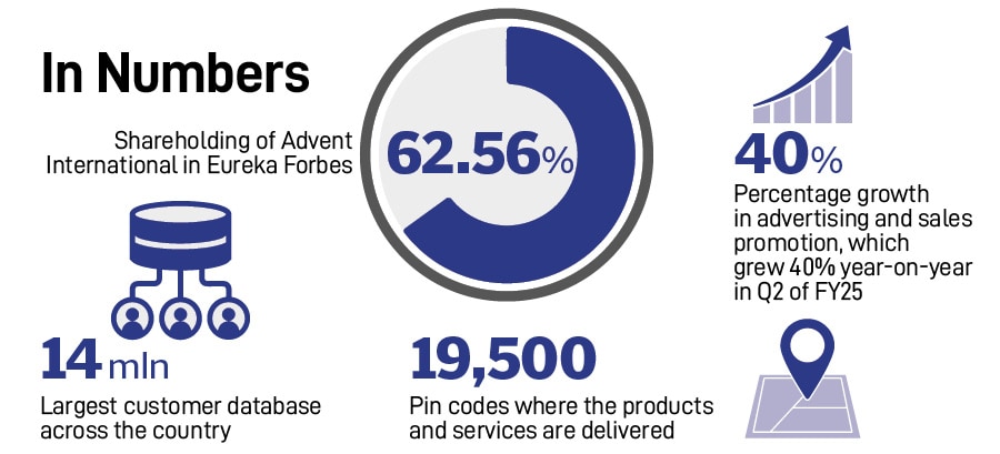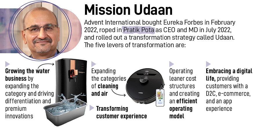The new owners are elated with the turnaround. "We are proud to champion Eureka Forbes on its transformative journey into a premier health tech company," says Sahil Dalal, managing director at Advent India, which owns a 62.56 percent stake in Eureka Forbes. Under Pota and his team of CXOs, the company has reinforced its market position, pioneering innovation and elevating customer satisfaction, he reckons, adding that the company is ensuring a sharp focus on technology and product innovation. “We are confident in the company’s dynamic growth trajectory," he adds.