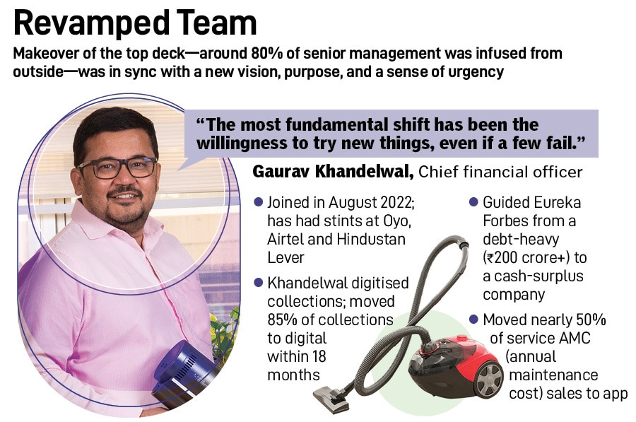 The new chief financial officer, Gaurav Khandelwal, inculcated a new language and mindset. “The most fundamental shift has been the mindset to challenge the status quo and willingness to try new things, even if a few fail," he says. However, a business with over Rs 200-crore debt needed much more than a mindset reboot it needed rewiring of internal and external business practices. “We bought in digitised collections," he says, adding that within 18 months Eureka Forbes saw nearly 85 percent of collections becoming digital. Annual maintenance charges (AMC) were revamped. In 18 months, he claims, nearly 50 percent of AMC sales moved to the digital platform.