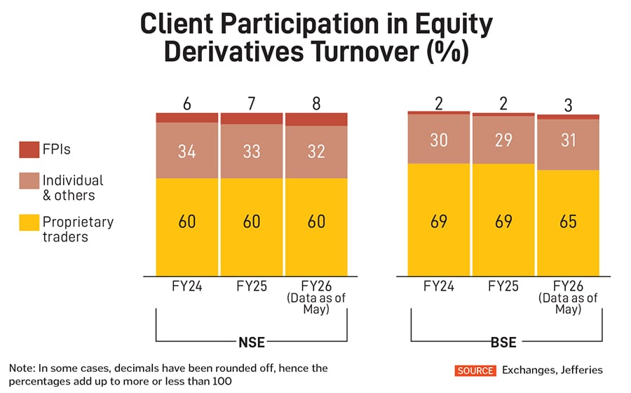 Exchange data shows FPIs form 3-8 percent of equity derivatives turnover and prop traders form 60-65 percent of the total while the rest is individuals and others.
