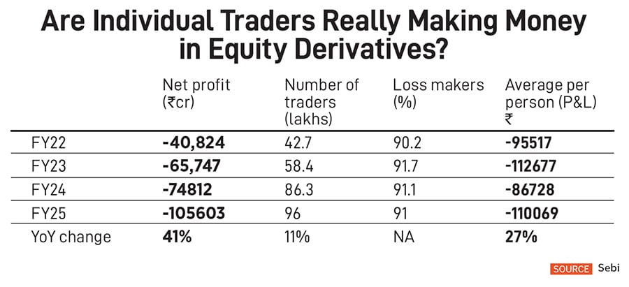 According to a study released by Sebi on July 7, at aggregate level, nearly 91 percent of individual traders incurred net loss in the equity derivatives segment (EDS) in FY2025.