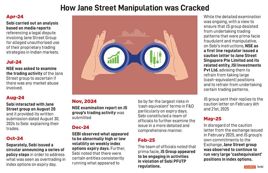 Meanwhile, Madhabi Puri Buch, former chairperson, Sebi, has slammed criticism that the market regulator was slow to act against Jane Street. Describing the claims of regulatory inaction as a "false narrative", in a note, Buch said that Sebi’s intervention began well before the matter became public. “In actuality, identification of index manipulation by Jane Street and initiation of numerous actions, including a cease-and-desist instruction to Jane Street, were carried out by Sebi between April 2024 and February 2025," Buch said. Her term as Sebi chief ended on February 28, 2025.