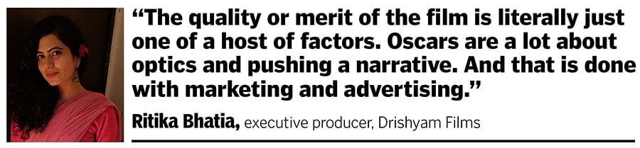 Ritika Bhatia, executive producer of independent studio Drishyam Films, agrees. She realised the enormity of an Oscar campaign when she went to promote their film Newton at the Academy Awards in 2017. “The quality or ‘merit’ of the film is literally just one of a host of factors. Oscars are a lot about optics and pushing a narrative—why this film deserves an Oscar, why it needs to be seen, how is it changing the world or society, and so on. And that is done with marketing and advertising," she explains.