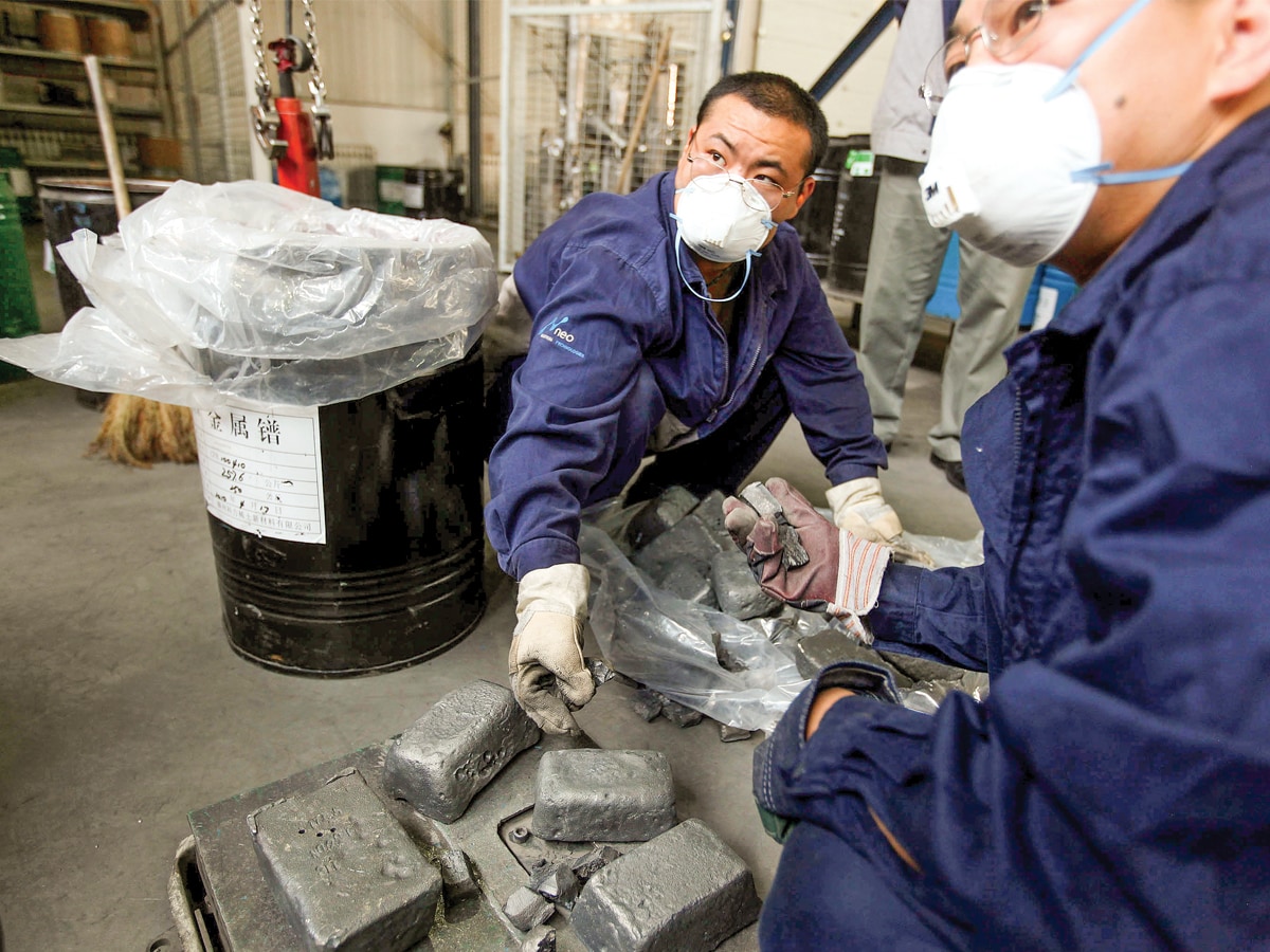 A file photo of workers handling neodymium ingots at Neo Material Technologies Inc’s Magnequench factory in Tianjin, ChinaImage: Doug Kanter / Bloomberg Via Getty Images