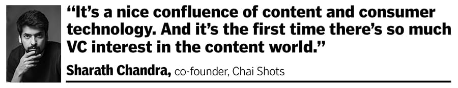 The stakeholders acknowledge that this is a nascent sector and there is a long way to go. Chandra, though, is happy with the money coming in and believes it will encourage content creators. “It is the first time there is so much VC interest in the content world. It is a good segue into content for the investor community. From here, they can start funding a production house or a film later," he says.