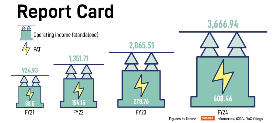 Fast forward to October 2024. Shirdi Sai Electricals has emerged as the second-biggest transformer maker in India in revenue and volume. The operating revenue has jumped from Rs924.93 crore in FY21 to Rs3,666.94 crore in FY24. During the same period, the PAT has increased from Rs88.50 crore to Rs608.46 crore. “Now only 50 percent of revenue comes from Andhra," claims Reddy, adding that the company has widened its reach to Bihar, Gujarat, Madhya Pradesh, and Odisha. The company has also expanded its play by acquiring a 75 percent stake in Indo Tech Transformers, a power and distribution transformer manufacturing company with manufacturing plants in Chennai and Kanchipuram in Tamil Nadu. The subsidiary too has grown at a brisk pace: Operating revenue has jumped from Rs91.61 crore in FY10 to Rs498.31 crore in FY24.