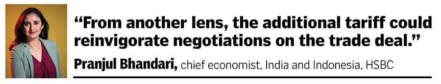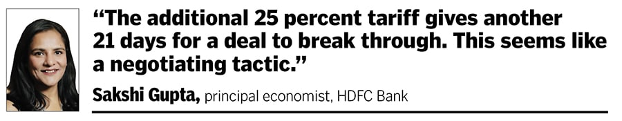 According to Pranjul Bhandari, chief economist, India and Indonesia, HSBC, the elevated tariff rate, if levied, could shave off over 0.3 percentage points from India’s growth, and the penalty rate could erase more. “From another lens, the announcement could reinvigorate negotiations on the India-US trade deal. We find that India has lowered oil imports from Russia in July," she adds.