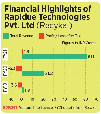 Today Recykal’s reach for waste collection and channelisation includes 1,000-plus businesses, 500 aggregators and waste management companies, over 150 recyclers, 1,000-odd kabadiwalas, 800-1000 ragpickers and 30 municipalities across 36 states and Union Territories. “Each stakeholder in the value chain has a different personality, different set of problems and different requirements. Revenues of the incorporated entity, Rapidue Technologies, shot up from Rs 1.8 crore in FY19 to Rs 21.2 crore in FY20. Losses went up marginally from Rs 3.6 crore in FY19 to Rs 5.3 crore in FY20, according to Venture Intelligence.