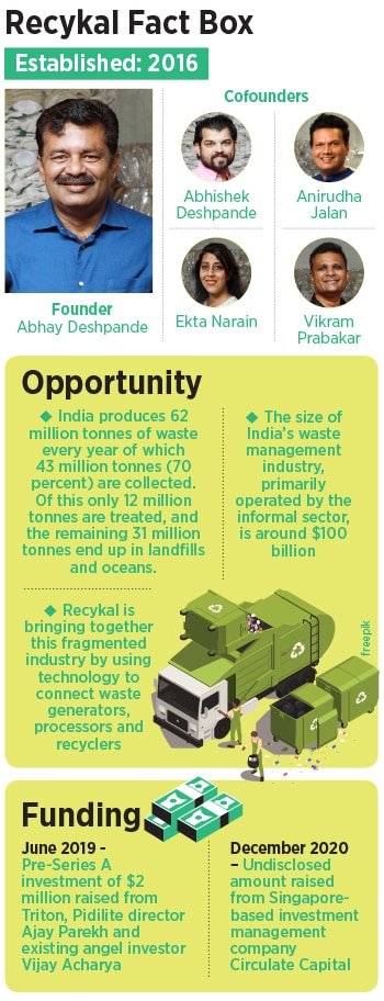 The fact that nobody focussed on the post-consumption market up until then provided further impetus to Deshpande. “Until 2016, India had seen lot of disruption in the pre-consumption and consumption market—Flipkart, Ola, Oyo, Zomato, Swiggy, MakeMyTrip etc. But nobody was focusing on post-consumption, that is waste. But, actually, there is nothing called waste because it is raw material for somebody else." So in early 2017, along with co-founders Abhishek Deshpande (Abhay’s cousin), Anirudha Jalan, Ekta Narain and Vikram Prabakar, Deshpande went headlong into waste management.