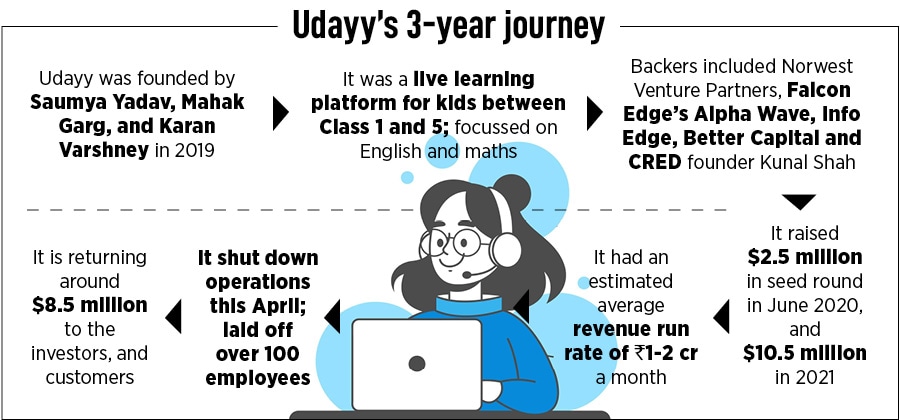 This March, Yadav’s dream had turned into a nightmare. Udayy had been on ventilator for a few weeks all ways to inject life into the terminally ill patient had failed, and the writing was on the wall. Udayy—a live learning platform in English and maths for kids in Classes 1 to 5—was about to die. There was no hope of saving it. Not even a faintest. “For long, I was in a zone where nothing went wrong," recalls Yadav, who raised $2.5 million in a seed round in June 2020, made most of the pandemic tailwinds to scale the venture, and raised another $10.5 million last year. In March, Yadav still had the last round of funding lying in her bank. “I had ample runway. I didn’t run out of money," she says.