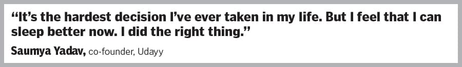 March 2022, Gurugram. “It felt like a brutal slap on my face," recalls Saumya Yadav. The first-time founder, who co-founded Udayy, an edtech venture, along with Mahak Garg and Karan Varshney in 2019, was facing the darkest moment of her life. Her dream run—cracking IIT in the first attempt, joining marquee global management consulting firm Kearney as a maiden job, making it to Stanford for MBA, and getting the backing of heavyweight investors such as Sanjeev Bikhchandani-owned Info Edge, Falcon Edge’s Alpha Wave (the investment firm behind Swiggy, Dream11, Policybazaar and Cred), and Better Capital—was coming to an end after three years. “It seemed like somebody had violently woken me up from my dream," recalls the young founder who turns 31 this July. “Nothing went wrong for so long. That’s why I thought nothing would go wrong," she says.