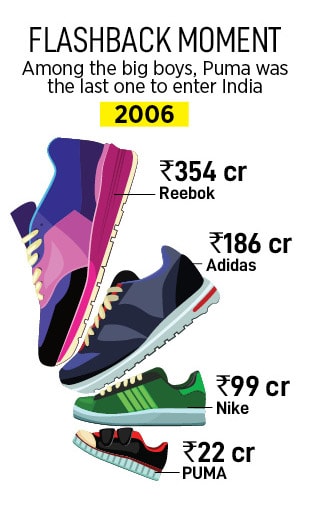 The intention was to forewarn. ‘The shoe will pinch’ is how Abhishek Ganguly’s colleagues and friends reacted when they got to know that the regional manager is quitting Reebok. After a three-year stint, Ganguly was set to join rival Puma as director of sales and marketing in November 2005. The concern was valid. Puma, which was the last among the big global sportswear makers to enter India in 2005, closed the first year with a puny revenue of Rs 22 crore. Compare this with the big boys: Nike posted FY06 sales of Rs 99 crore Adidas was sitting pretty with Rs 186 crore and Reebok was on the top of the heap with a staggering Rs 354 crore.