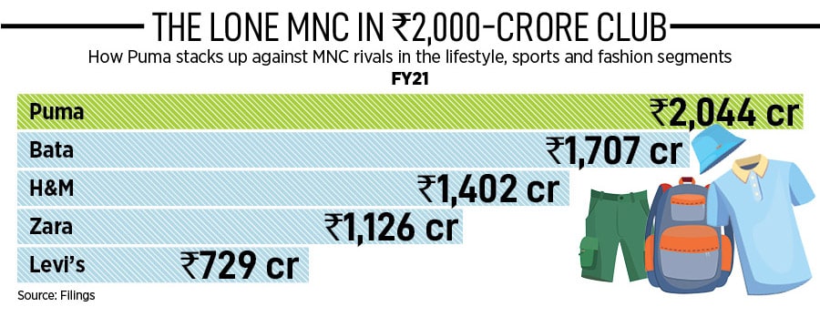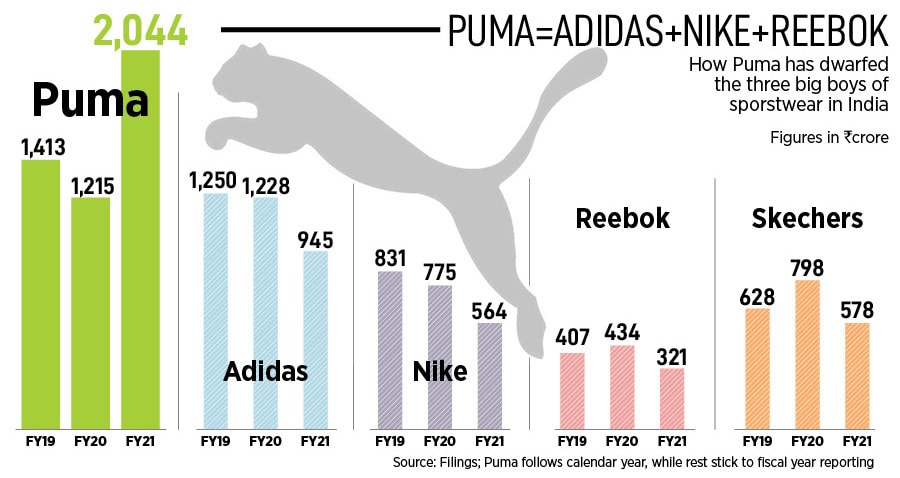Fast forward to March 2022. Puma has clocked Rs 2,044 crore in revenue in FY21 as against Rs 1,215 crore in FY20, making it the first multinational sportswear and fashion brand to enter into the Rs 2,000-crore club in India (see box). What, though, is most interesting is the big leap over its rivals. Puma is now bigger than Adidas, Reebok, and Nike combined. The underdog is now the top dog.