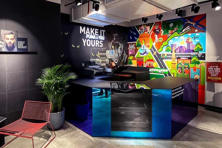 The state-of-the-art customization studio at the PUMA India’s store at Cyber Hub, Gurgaon. The embroidery and printing machine allows consumers to customise and personalise PUMA footwear, apparel and accessories using paints, dips, dyes, patchwork, embroidery, 3D knitting, laser printing, and pinning