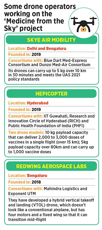 Bengaluru-based Redwing Aerospace Labs—also working on the Medicine from the Sky project—has developed a hybrid vertical takeoff and landing (VTOL) drone. “It doesn’t look like a conventional airplane, but has four motors and a fixed wing so that it can transition mid-flight and gain that range," explains co-founder Rishabh Gupta who first developed this prototype in 2018. They used these drones in Papua New Guinea to deliver polio vaccines for an organisation called WeRobotics and also work with the US Centers for Disease Control and Prevention and the Gates Foundation. “The idea was to showcase how vaccines can be delivered in far-flung areas to the stakeholders," says Gupta.