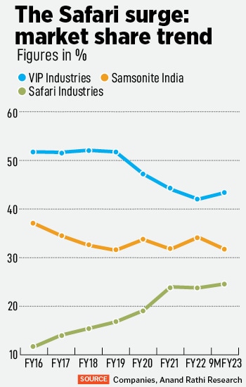Safari’s market share in the branded space has risen to 24 percent in April-December 2022, from 16.7 percent in the year-ended March 2019. In the same period, VIP Industries has seen its market share fall to around 44 percent from 51.5 percent while another rival Samsonite India’s market share hovers around 32 percent.