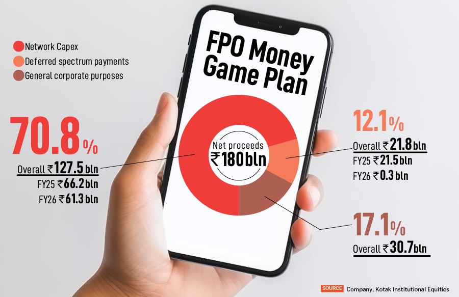Most of the money raised through the FPO is likely to be spent on capex, expansion of network and rolling out of 5G networks. Around Rs 12,750 crore is expected to be used for buying equipment for expansion of network infrastructure. This will include setting up new 4G sites and expanding the capacity of existing and new 4G sites, setting up new 5G sites, the company says in its RHP.