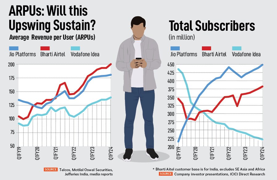 Also for a few years more, 4G is going to remain the meaningful contributor to revenues for these telcos. Monetising 5G technology will not only be tough but it will also take time. VI has bought 5G spectrum (mid-band 3300 MHz and high-speed mmWave) worth Rs18,799 at last year’s spectrum auction.