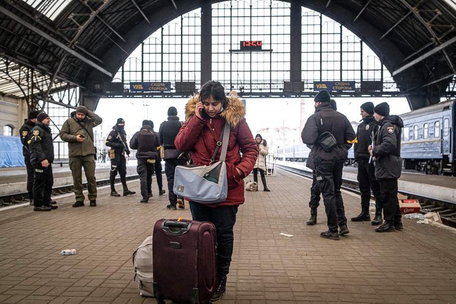 An Indian student from Sumy in Eastern Ukraine arrives at the main train station in Lviv, Ukraine, on March 9, 2022, through a humanitarian corridor created to evacuate them. Image: Adri Salido/Anadolu Agency via Getty Images