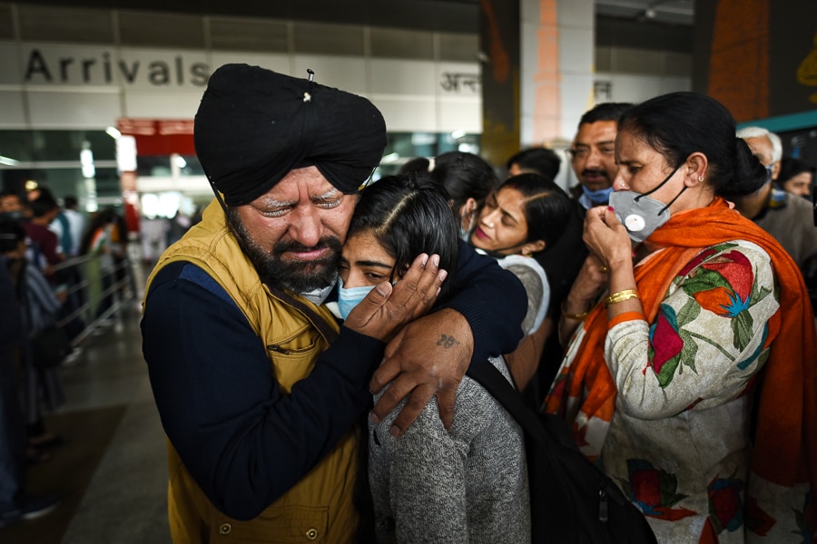 A student embraces her father overcome with emotion at the international airport in Delhi upon her return from conflict-torn Ukraine on an Indian rescue aircraft on March 5, 2022 in New Delhi, India.Photo by Sanchit Khanna/Hindustan Times via Getty Images