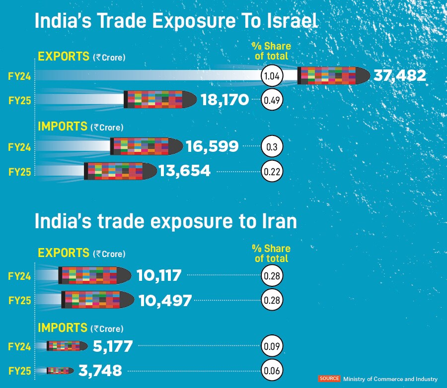 India’s direct trade with Israel and Iran is minuscule at less than 1 percent of the total trade involving India last fiscal. While India’s major export to Iran is basmati rice, trade with Israel is more diversified, and includes fertilisers, diamonds and electrical equipment.