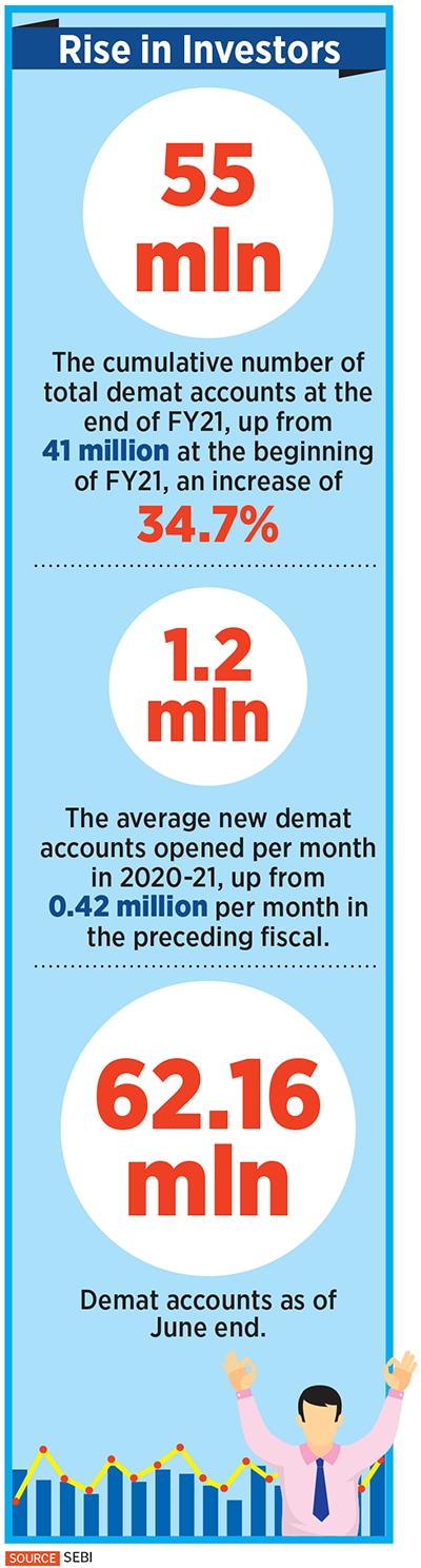 Even as market indices have been scaling new peaks every month this year, the cumulative number of total demat accounts increased from 41 million at the beginning of FY21 to 55 million by the end of FY21, an increase of 34.7 percent, according to recent Securities and Exchange Board of India (SEBI) data. On an average, about 1.2 million new demat accounts were opened per month in FY2020-21 as compared to 0.42 million per month during the preceding fiscal. As of June end there were 62.16 million demat accounts in the country. The Central Depository Services (India) opened a record 1.47 million accounts in January, up more than threefold from the same month in 2020, and 1.36 million in February.