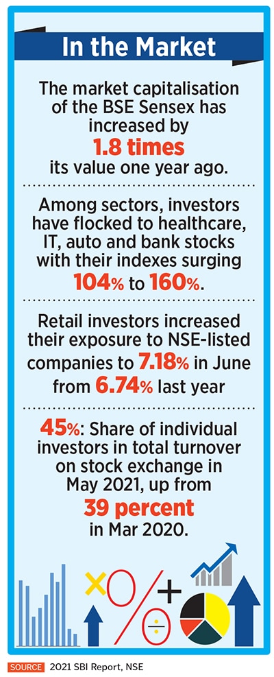 Retail investors flocked to select sectors like healthcare, IT, auto and bank stocks with their indexes surging 104 to 160 percent, according to ACE Equity. Apart from pumping in money in the secondary market, new investors have also been chasing initial public offerings (IPOs) as well as newer avenues like crypto currency and non-fungible tokens (NFTs).