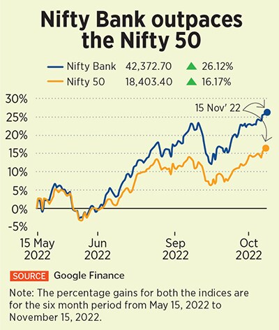 The reduced pressure on banks’ top management to deal with bad loans and focus on lending has clearly reflected in the Q2FY23 earnings. In the Motilal Oswal Financial Services (MOFSL) portfolio, the public sector and private sector banks have seen a Q2FY23 earnings upgrade of 12.3 percent and 2.7 percent respectively. Improved profitability and return on asset growth has started to get reflected in the stock prices of the top banks (see Nifty Bank chart).