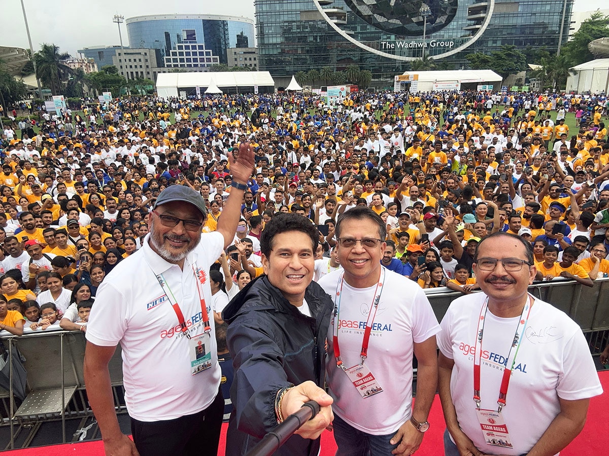 Sachin Tendulkar flags off the Ageas Federal Mumbai Half Marathon organised by NEB Sports. Image: Courtesy NEB Sports