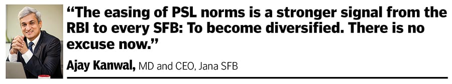 “The 75 percent PSL rate did not stop us from doing 70 percent secured. The easing of PSL norms is a stronger signal from the RBI to every SFB: To become diversified. There is no excuse now," says Ajay Kanwal, managing director and CEO, Jana Small Finance Bank. “We are not constrained any way."