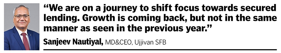 Nautiyal says affordable housing, which is the second-largest portfolio for the bank (23 percent of size ₹7,308 crore), after microfinance, will become a significant player in the ecosystem, having grown 48 percent year-on-year. The bank’s MSME is another vertical showing good traction from last year, up 45 percent for the year to ₹2,047 crore in size. But both these offer low yields. Ujjivan will need to focus on its high-yielding growth product lines such as micro mortgage and vehicle loans besides the risky microfinance.
