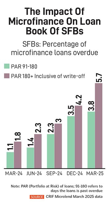 SFBs such as Utkarsh Small Finance Bank show sluggish disbursements and a near quadrupling in GNPAs in the March-ended 2025 quarter from a year ago, while pure microfinance firm Fusion Finance has seen GNPAs rising over the past four to five quarters, and lower income and margins. The much larger microfinance institution, Credit Access Grameen, has seen an 88 percent decline in profit for the March-ended quarter while resorting to an accelerated write-off of loans.