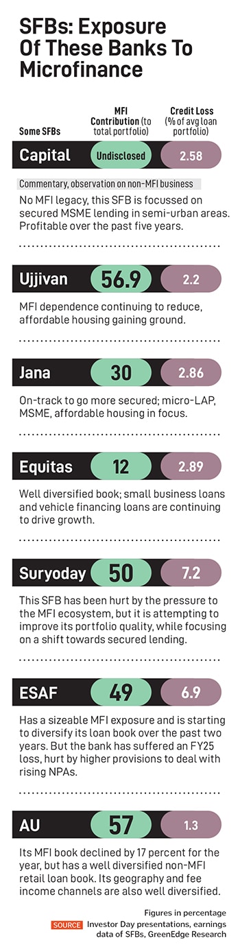 SFBs had sought this relief from the market regulator for a few months. Several SFBs have microfinance-led promoters due to the nature of their lending, which meant being focussed on small businesses, micro and small enterprises, marginal farmers and the the unorganised sector (see loan book data). Several SFBs, with the exception of Capital SFB—a former local area bank—have had a sizeable exposure to microfinance and unsecured lending. Rising bad loans have forced them to alter their business model by deliberately calibrating their exposure to microfinance and rapidly diversifying their lending book towards other sectors.