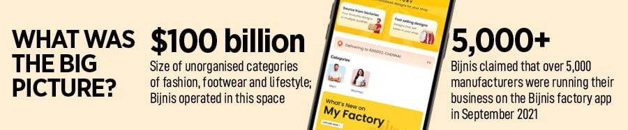 September 2021, New Delhi. Let’s start the story from the climax. It was September 2021. Bijnis, a B2B platform for the unorganised retail segment such as footwear and apparel, raised $30 million in a series B round of funding led by WestBridge Capital. Existing investors such as Info Edge, Matrix Partners India, Sequoia Capital, and WaterBridge Ventures too participated in the round. Big backers, a big round of funding, and big prospects… everything was going well for bijnis.