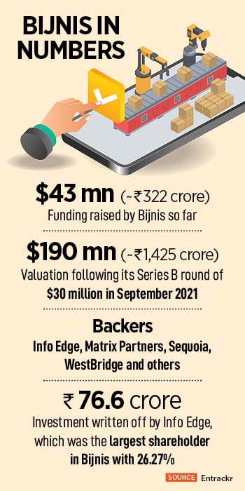 Around 18 months later, the vision is blurred, and the mission looks lost. In May 2023, Info Edge wrote off its entire investment in bijnis. “Following the principles of conservatism and prudence and after due consideration of factors including continuing cash burn, limited availability of cash in proportion to unspecified liabilities with respect to buyback obligations, and uncertainty of future capital raise… the investment has lost its inherent value," the company highlighted in its regulatory filings.