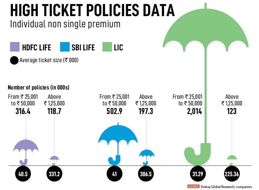 Data shows that the average ticket size of individual regular policies where the annual premium is above Rs 1.25 lakh varies for insurance companies. For HDFC Life there are 1.19 lakh such policies with an average ticket size of Rs 3.3 lakh, while for LIC there are 1.23 lakh such policies for an average ticket size of Rs 2.2 lakh (see table).