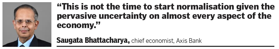 Saugata Bhattacharya, chief economist, Axis Bank, says the monetary policy response will depend on the space available to fiscal policy to absorb some of the price and income impact. “We believe that this is not the time to start normalisation, given the pervasive uncertainty on almost every aspect of the economy," he adds.