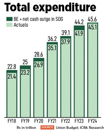 Given the extension of the free food scheme and pre-election spending requirements, Bajoria expects revenue expenditure (revex) to grow slightly faster in the next fiscal year than that budgeted for FY2023-24. He expects the government to peg total expenditure at about Rs 49.1 trillion for FY2024-25, about 9 percent higher than FY24"s budgeted Rs 45 trillion. Revex will likely be budgeted at Rs 37.6 trillion with likely increases in allocations to flagship schemes such as PM Kisan, and MGNREGS.