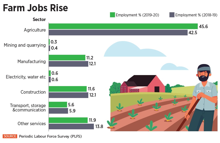 The latest Periodic Labour Force Survey (PLFS) for the 2019-20 period corroborates this alarming trend. It states that jobs in agriculture rose to 45.6 percent from 42.5 percent in the previous year. However, employment across manufacturing and construction declined during the same period (see chart).