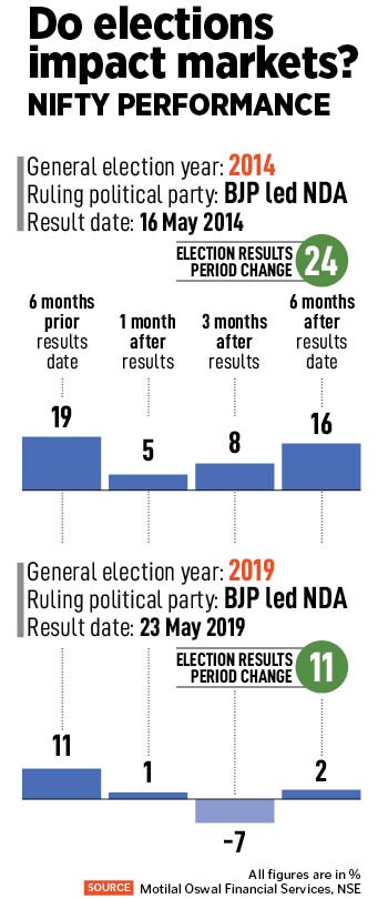 According to an analysis by Motilal Oswal Financial Services, the 50-share index Nifty has surged (9 to 36 percent) six months into the announcement of general election results on five previous such occasions between 1999 and 2019. The six-month period considered for the analysis are November to May.