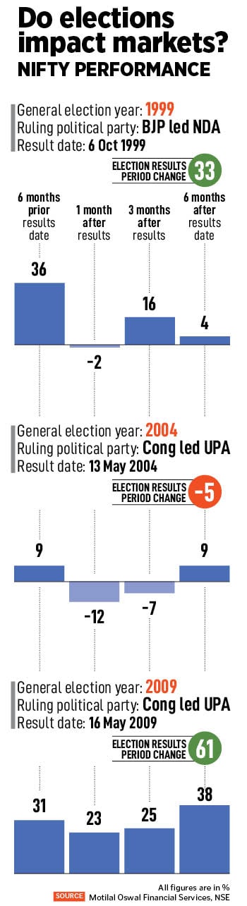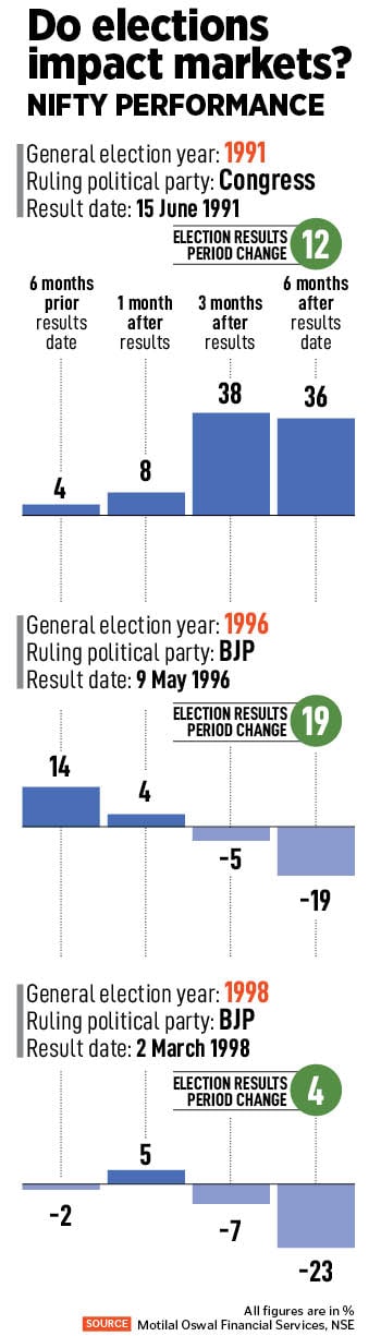 For general elections between 1991 and 2019, the Nifty rose eight out of nine times. In one of the biggest rallies in the six-months prior to results, the Nifty surged 36 percent in 1999, when the BJP-led NDA formed the government, while in 2009, the Nifty gained 31 percent when the Congress-led UPA came to power.