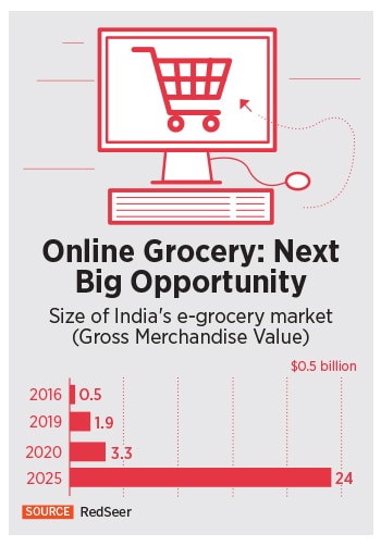 Industry watchers are not surprised with Zomato’s move broadly for two reasons. First, online grocery business has got a massive boost due to the pandemic. From $1.9 billion in GMV (gross merchandise value), the e-grocery market leapfrogged to $3.3 billion last year, according RedSeer. The contribution of fruit, vegetable and staples, the consulting firm pointed out in its report released early this year, stood at a staggering 47 percent. What is interesting, though, is the projection. By 2025, the e-grocery market is estimated to be valued at over $24 billion.