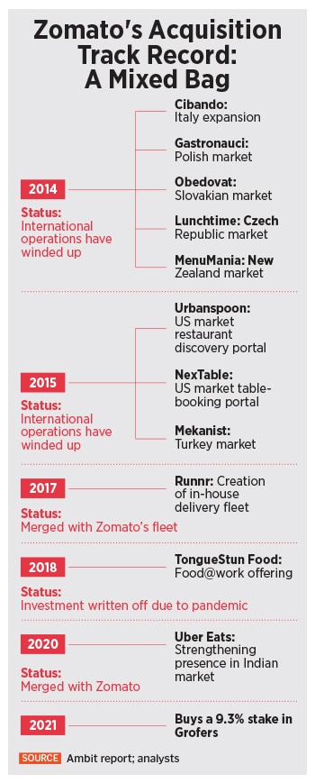 Against the mixed track record of Zomato in its acquisition strategies, Grofers’ deal too does not look too promising. “Zomato has struggled with its acquisitions," points out Ambit in its analyst report. “They tried to expand in multiple geographies but they failed," it adds, listing out prominent examples of large write-offs. The acquisition of Urbanspoon [a US restaurant information and recommendation service] in 2015 for over $50 million and shutting down its operations within five months was a big jolt for the company, the report highlights. Another US-based acquisition in 2015 was written off in 2020.